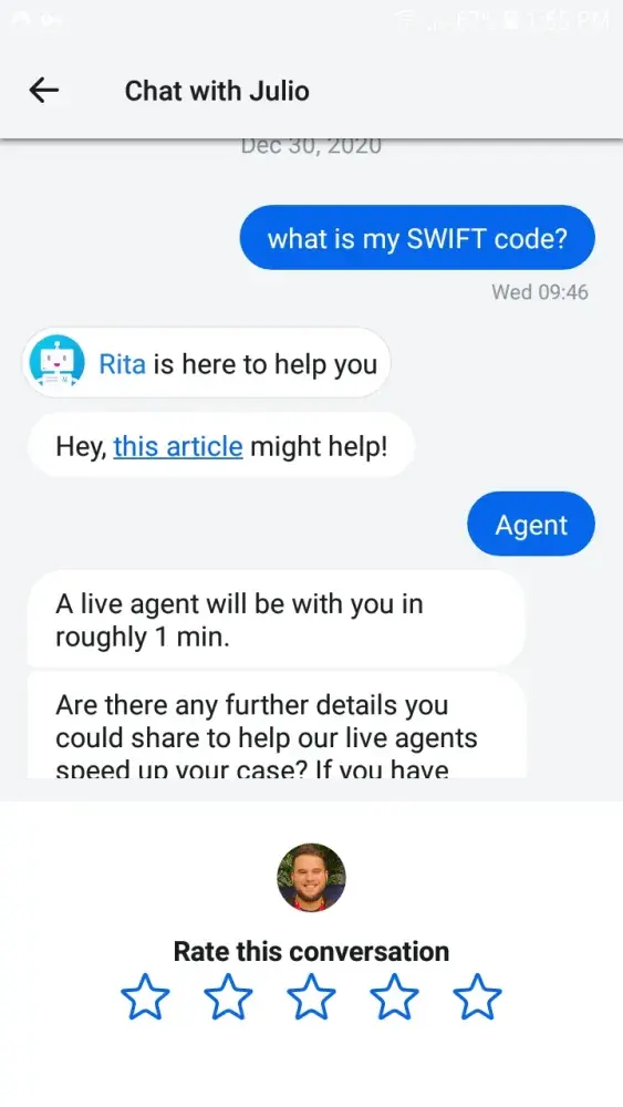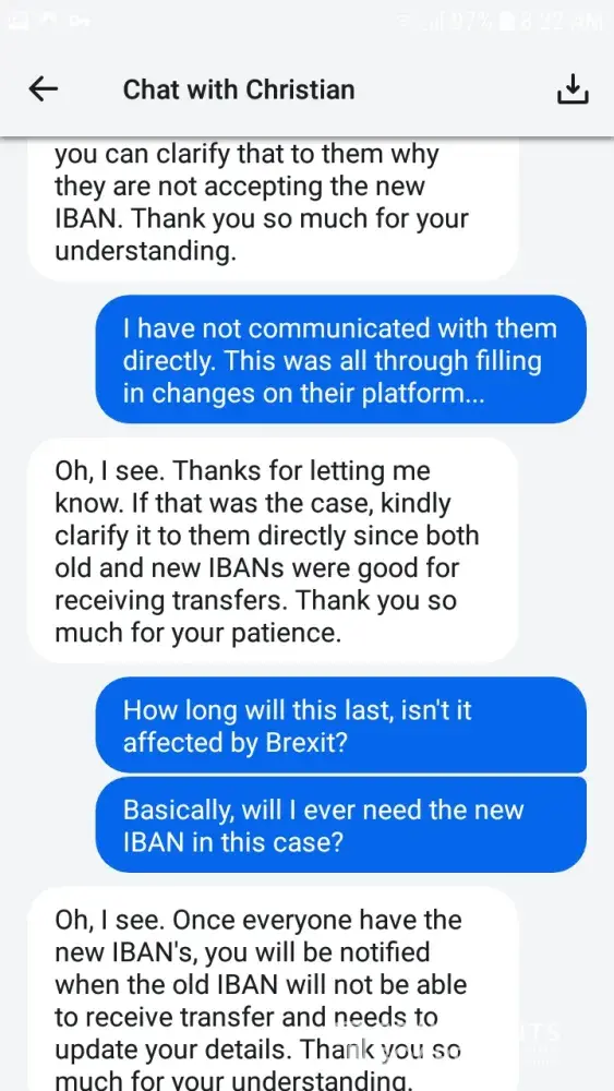 In early December I was asked to update my IBAN number on Revolut to comply with new standards set as a result of Brexit. Since I use the Paxos platform to transfer my cryptocurrency into Euro, I tried to update my IBAN number as requested by Revolut. I had some trouble doing so and referred to the customer care chat of Revolut for answers. I was addressed by one member of their team named 'Christian'. The outcome of that conversation was 'don't worry about it until it actually becomes a problem.' Please see print screens.
