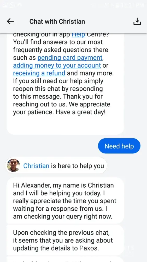 I immediately referred to Revolut to resolve this issue as I didn't have the money for my holiday and my money was now stuck in my Paxos account without the chance of moving it until it was resolved. My initial message to Revolut was sent at 8.20 in the morning and after a full day of correspondence and communication with Revolut and a couple emails to Paxos, the situation was not finalized.
