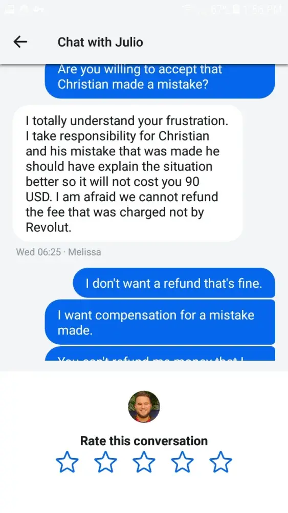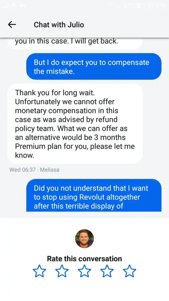 The manager attempted to divert the conversation away from the issue for over an hour until I insisted that my issue was the failure on Christian's part to solve the issue as it came up. When she did finally admit that a member of her team had failed to do their job, she offered me compensation of a free upgrade for three months to their premium package. Earlier in the year I showed intention to upgrade to their metal package, the highest upgrade possible and had explained to the floor manager 'Melissa', that after this lapse of trust with their company, having already spent over 14 hours at this point dealing with their customer services, that I was uninterested in continuing my relationship with Revolut altogether, this offer was an insult to me as a customer.