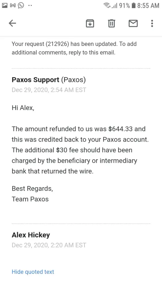 I eventually received my money, minus the $90 in charges that came from all of the back and forth through Paxos. I didn't get to go on the holiday I had planned because the money did not arrive on time and I wasted over 16 hours of my life thanks to the lack of taking the situation with the necessary seriousness that it had.