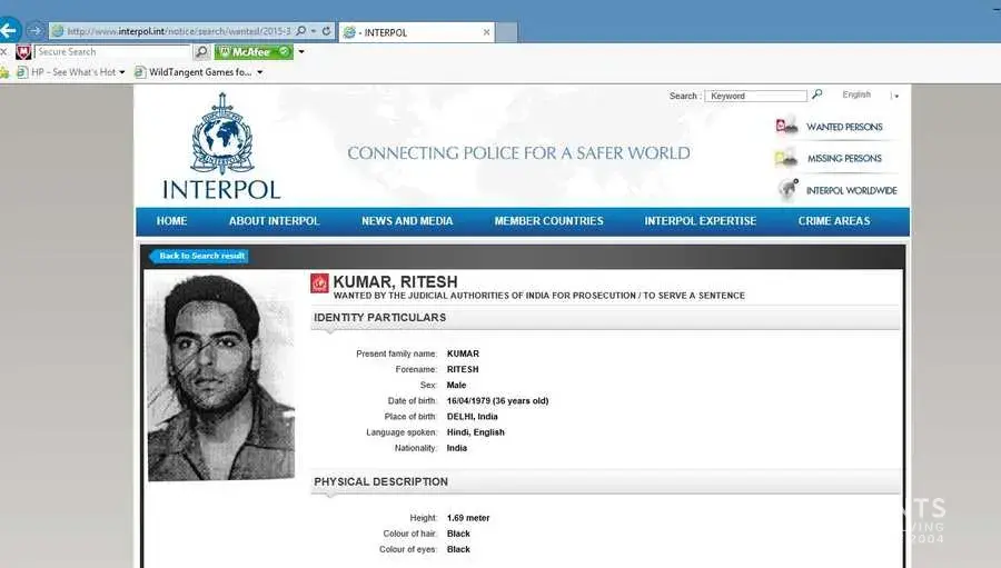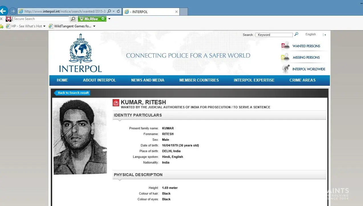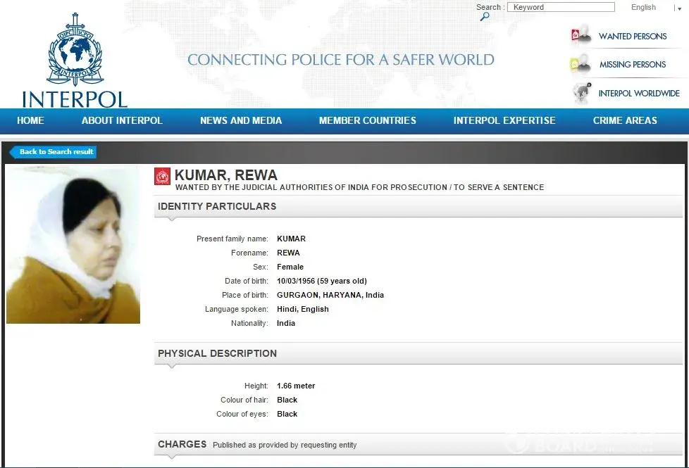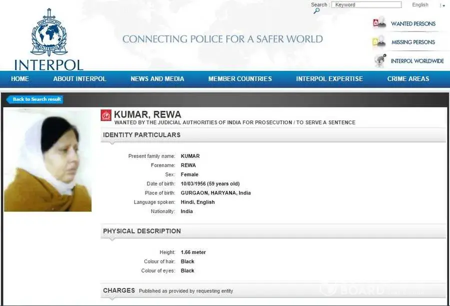 A grab from the Interpol website listing Rewa Kumar’s particulars and her offences.