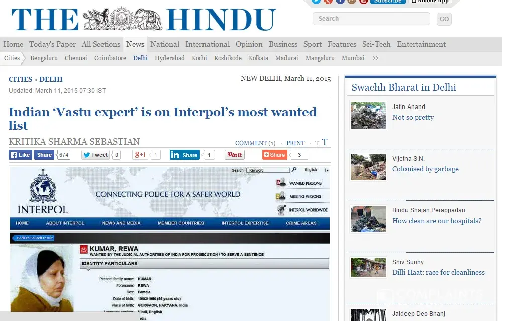 Can so called Vastu Shahtri and fake degree holder and was involved various criminal activities and was arrested by Delhi Police on 12 Jan 2006 Rewa Kumar, her so called husband Manohar Lal, who got suspend from Delhi Police by Home Ministry due to various criminal activities and he son Ritesh Kumar was also involved in various forged and criminal activities and was arrested by Delhi Police and now world know numerologist . can say about this report from Delhi Police is also fake and she is only right ? She can bribe to corrupt officers to hide her name from Interpol ( Readers - Please mind it - her name is completely not washed out from INTERPOL just hidden on her cheat request to human rights ) and make fool to innocent people to use them but reality will come one day and she will be at right place .