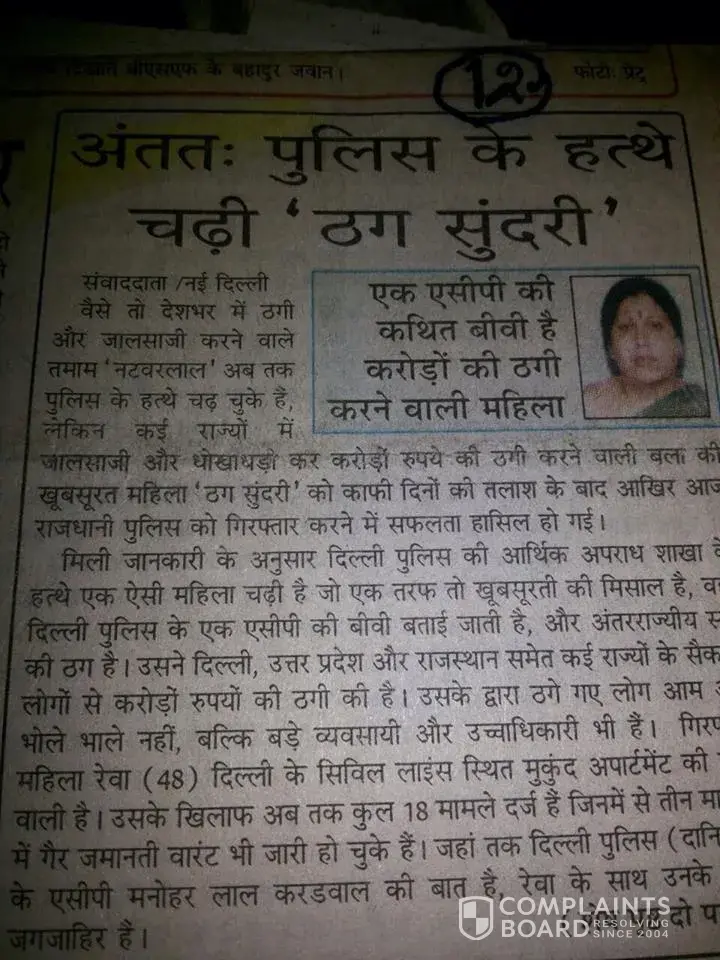 इंटरपोल पà¥à¤²à¤¿à¤¸ अधिकारियों के अनà¥à¤¸à¤¾à¤° वांटेड आरोपी महिला शà¥à¤°à¥€à¤—ंगानगर निवासी रेवा कà¥à¤®à¤¾à¤° (59) दिलà¥à¤²à¥€ में 2009 से फरार है। वे मूलतः गà¥à¤¡à¤¼à¤—ांव की रहने वाली है। गà¥à¤¡à¤—ांव में अपने à¤à¤¾à¤ˆ के पते पर फरà¥à¤œà¥€ पासपोरà¥à¤Ÿ बनाकर कैलिफोरà¥à¤¨à¤¿à¤¯à¤¾ जाने में सफल हो गई। उसे दिलà¥à¤²à¥€ तीस हजारी कोरà¥à¤Ÿ ने à¤à¤—ोड़ा घोषित किया है। आरà¥à¤¥à¤¿à¤• अपराधों की जांच कर सीबीआई ने उसके खिलाफ 9 मारà¥à¤š काे रेड कॉरà¥à¤¨à¤° जारी किया है। आरोपी महिला ने अमेरिकी राषà¥à¤Ÿà¥à¤°à¤ªà¤¤à¤¿ के साथ खिंचवाया फोटो अपनी वेबसाइट पर लगाया है। इंटरपोल सीबीआई ने अपनी वेब साइट पर राषà¥à¤Ÿà¥à¤°à¤ªà¤¤à¤¿ ओबामा के साथ खड़ी आरोपी महिला को वांटेड बताया है। महिला दà¥à¤µà¤¾à¤°à¤¾ मेवाड़ यूनिवरà¥à¤¸à¤¿à¤Ÿà¥€ उदयपà¥à¤° से ली गई पीà¤à¤šà¤¡à¥€ डिगà¥à¤°à¤¿à¤¯à¤¾à¤‚ à¤à¥€ फरà¥à¤œà¥€ पाई हैं। आरोपी महिला रेवा कà¥à¤®à¤¾à¤° के पति मनोहर लाल कररवाल दिलà¥à¤²à¥€ पà¥à¤²à¤¿à¤¸ में अधिकारी रह चà¥à¤•े। मनोहर कररवाल की रेवा कà¥à¤®à¤¾à¤° से 22 वरà¥à¤· पहले दूसरी शादी हà¥à¤ˆ थी। मनोहर ने 2006 में नौकरी छोड़ दी।