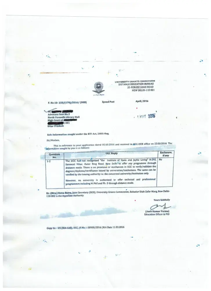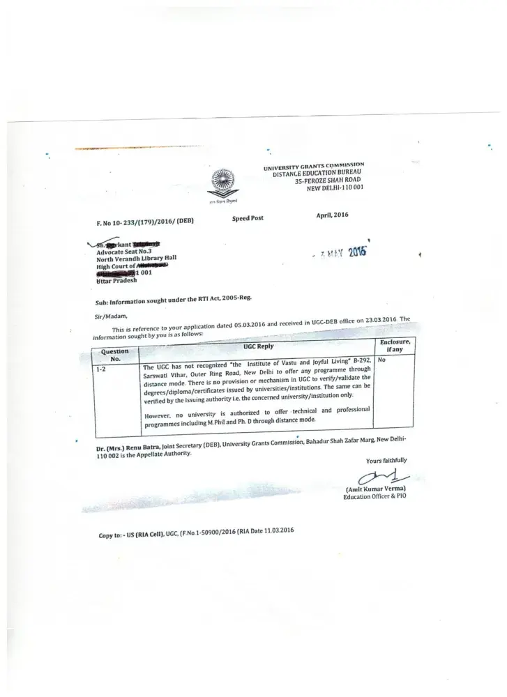 It has been proved from University Grant Commission that her P H D is fake as Joyful living Vastu Institute is not listed with U G C and only Universities are authorized to grant the P H D . and NO one University is authorized to grant P H D on distance education mode . If she didn't went to India from 4 years and Universities don't grant PH D on distance mode then you guys think that she is claiming fake P H D . Friends . Please understand her THUG mind and making fool on the name of Vastu . .those who are supporting her they also know about it but looks like they are also in the same category and they will also come under investigation soon .