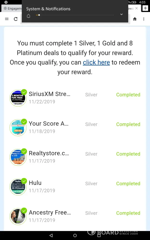 I did all of the requirements I was supposed to do plus more since every time I did a platinum offer that was clearly on the platinum offer page it would credit it as a silver offer completed instead. Sent them an email about 5-6 days ago and no response. Now my browser/wi-fi provider won't even let me sign onto their website since it's been flagged as harmful to my phone now.