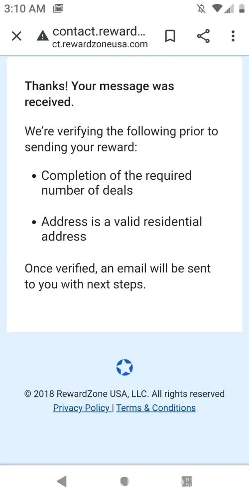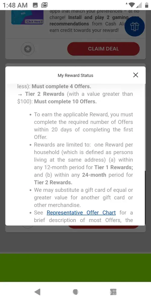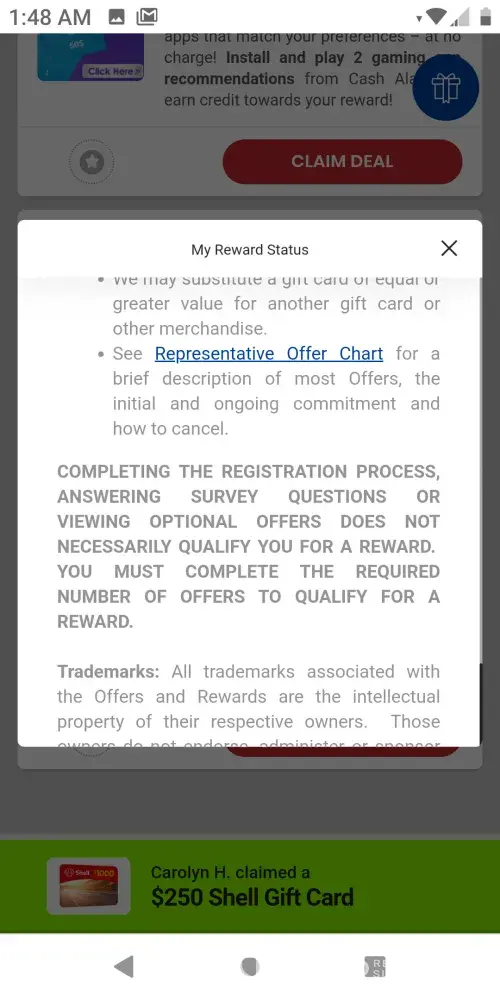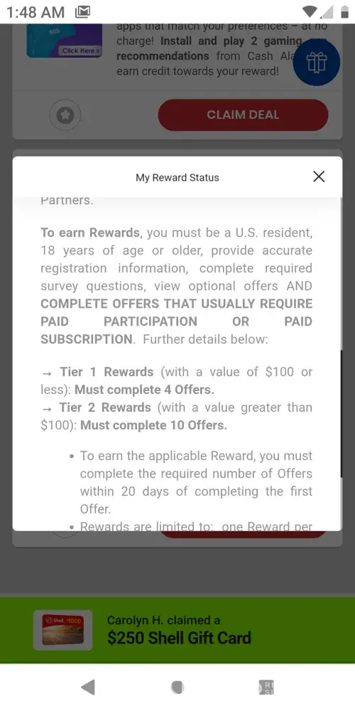 Why does it keep saying that? Will I even get my reward and when would I get it by? Or is all this just a bogus scam to try and get people to do basically a bunch of nothing for nothing. Except to get people to sign up for all these trials and make purchases on things they really didn't want or wasn't even interested in. And not to mention all the data we use and all the storage space we take up for downloading unnecessary items just so we could compete all the tasks. Below are screen shots so you can see for yourself