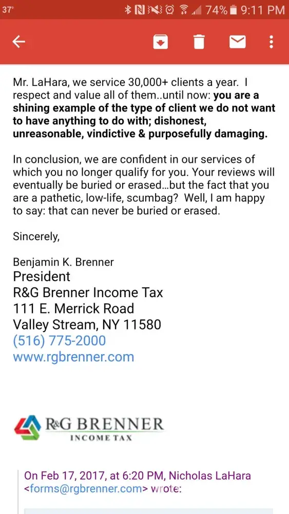 ***For all who left good reviews, I implore you to double check your tax filings or have another professional do so. If R&G Brenner made a mistake that causes you to owe interest and penalties, they will not refund you for that nor your preparation fees.***