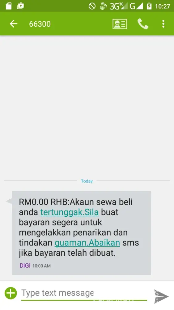 The number that used for the sms is 66300. I've tried to ignore this kind of unknown message but still sending me a message with that statement every month. If there has any person who used up your bank's name to threaten peoples, it is more better to your bank (RHB Bank) to take strictly action towards this issue.