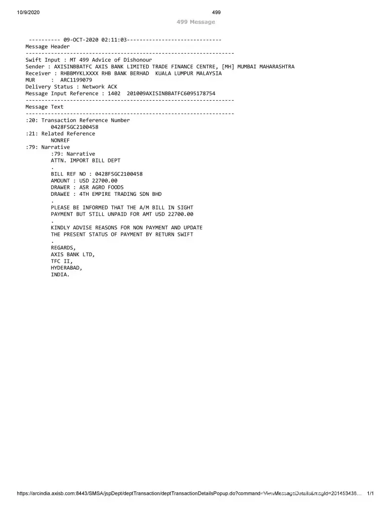 after the shipment, on 18.09.2020, our company asr agro foods send the documents to rhb islamic bank berhad (680329-v) malaysia bank through axis bank ltd bank india for collection of usd 22700 (dp payment)