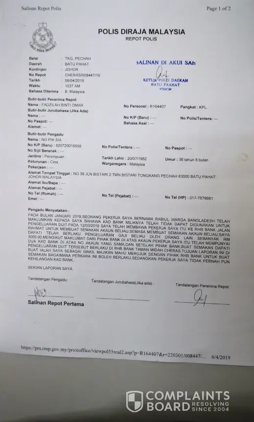 My worker, Mr.Rabiul (account No: [protected]) account had been fradulently withdraw funds by other party in Cheras in Kuala Lumpur. When check with local Bank in Batu Pahat, there are two card exists under this account, whereas only one card with MR.Rabiul, the other card is suspiciously created by bank!