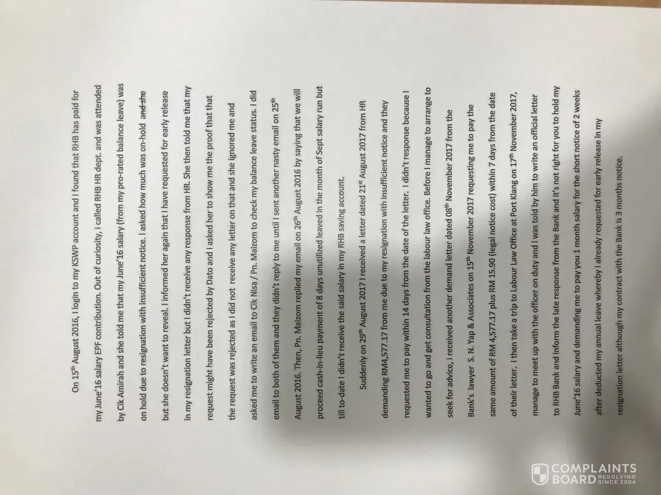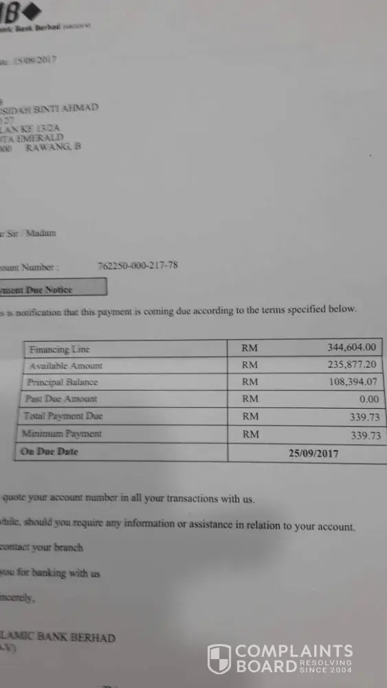 Pada pertengahan tahun 2017, saya telah menerima panggilan lagi dari wakil rhb bank dan menyatakan perlu untuk membuat pembayaran bagi menggelakkan tindakan undang-undang terhadap saya dibuat. Saya menjadi hairan, setahu saya pada masa kehadiran wakil bank ke restoran kami, pemahaman saya pembukaan akaun tersebut adalah akaun simpanan kenapa saya perlu buat pembayaran dan tertunggak pula tu?