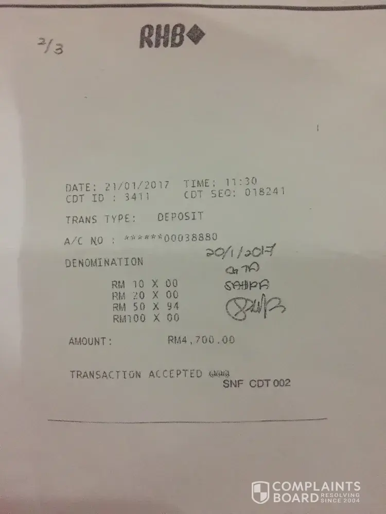 Pada 21/1/2017 pukul 11.30 pagi saya telah memasukkan sejumlah duit rm 4700 di mesin deposit di giant tampoi ... no akaun sepatutnya [protected] tetapi saya masuk ke akaun [protected] (tan kok wai ) sepatutnya saya masuk kan ke dalam akaun company saya, akan tetapi saya telah salah masuk akaun org lain di sebabkan machine ketika itu blur ... kemudian saya telah call customer service rhb namun mereka kata tidak boleh dapat balik ... kemudian saya telah buat report polis dan telah pergi ke rhb bank di mana owner akaun tersebut buka akaun di taman bahgia kl namun mereka bg alasan sama ... saya ada bukti saya salah masuk akaun hanya pulang balik amount y saya salah bank in sebab saya ada bukti ... boleh tak pihak rhb buat sesuatu dgn kes ini? Sebab kes bulan 1 skrg sudah hujung tahun namun phk rhb tetap tidak beri sebarang maklum balas ...