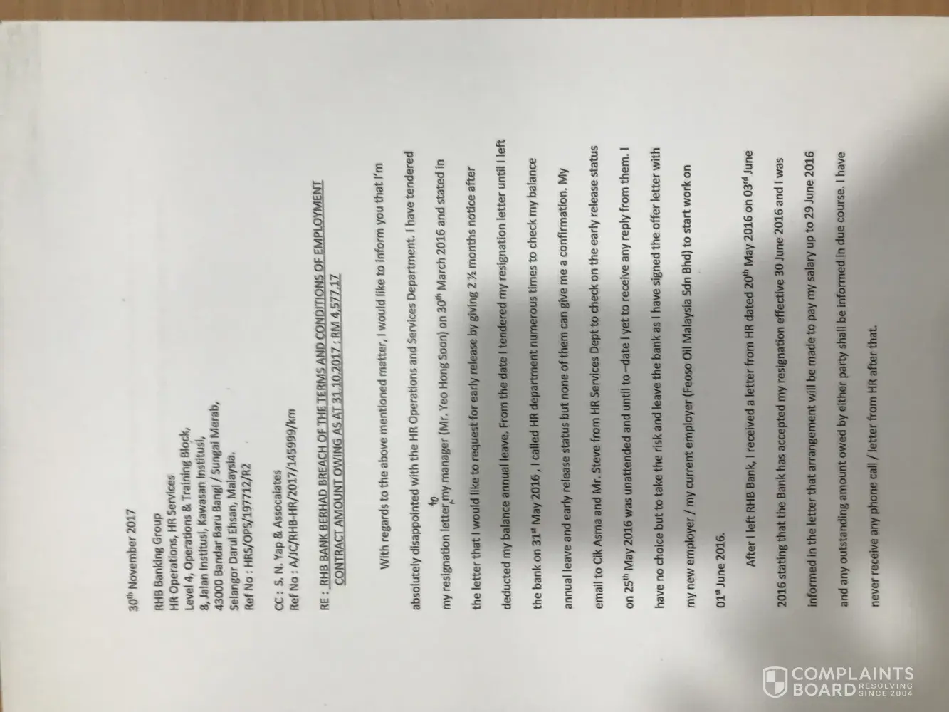 I have tendered my resignation letter on 30th March 2016 by giving 2 1/2 months notice ( instead of 3 months notice in contract) and requested for early release in my letter. My request was unattended and the GHR always respond late. I left the Bank on 31st May 2016 and i assumed the HR accepted my resignation and early release because i have given them the notice but no reply from them. Suddenly, i received letter of demand from the HR and also their lawyer (S.N. Yap & Associates) to request for the 1 month pay for the insufficient notice due to breached of contract after 1 year and 3 months from they day i left the Bank. I felt very frustrated as i didn't receive my balance pro-rated annual leave pay and it should be contra from my owing to the bank (if you insisted me to pay back to the Bank). After deducted my annual leave, weekend and public holiday in June'16, the short notice is around 1 week only and why is the Bank so calculative and inconsiderate as 3 months notice is too long, is hard for us to find a new job as new employer can't wait ).