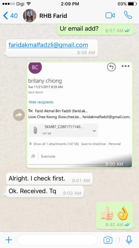 Secondly, I had received a call from Farid again and saying we miss out a from and sign to pass him the form. We had received the mail which Farid and his superior Liow Chee Keong as sender the form to me. I m asked to return the mail with the signature on it as acceptance of the offer letter. After sign the letter and I replied to Farid and cc. to his superior Liow Chee Keong as well. I had been sending the mail twice as I keeping it right now.