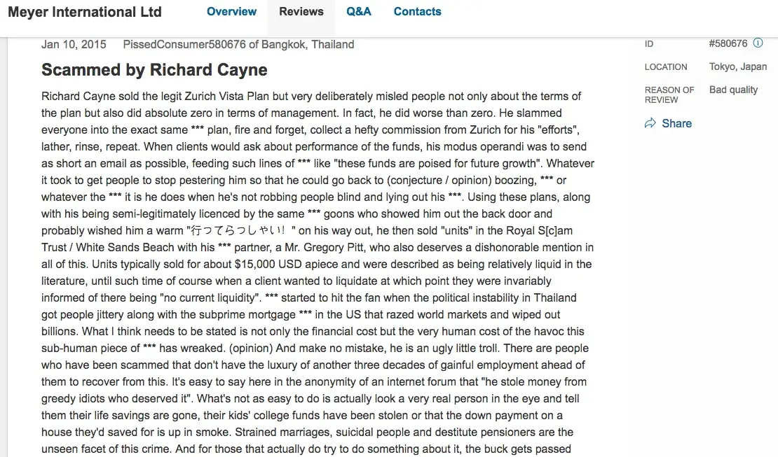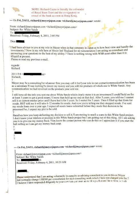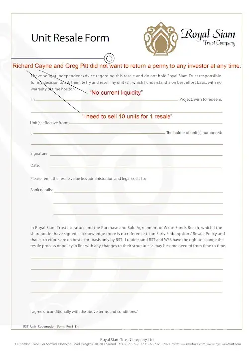 Now that it has been fully proven Richard Cayne has stolen US millions of our money while playing games and lying to us for many years on bogus claims in White Sands Beach he must start honouring the redemptions we filed years ago with his Royal Siam Trust that he denied. The Thai court did not honour our claims of course with his usual stall, blame and deflect bulls**t as we were told by another man plus a law firm for many years but Richard kept playing games and abusing us. We will be posting all of this including the evidence of the millions he stole and the lies to courts. Shame on you and your paid lawyers in Bangkok Richard.