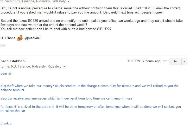 The other issue is with my purchased of 2006 E350 Mercedes witch was shipped on times but the color of the vehicle was mentioned black instead of Gold color! the car is still in the yard for the last 3 weeks without any explanation from the ride safely office here in Dubai!