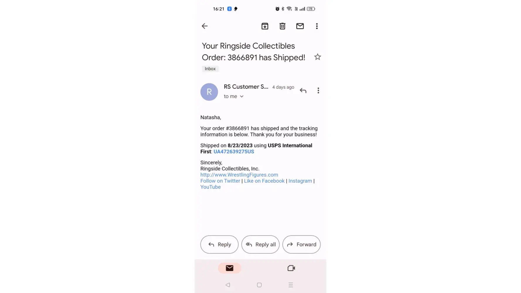 I ordered action figures from Ringside Collectibles in November