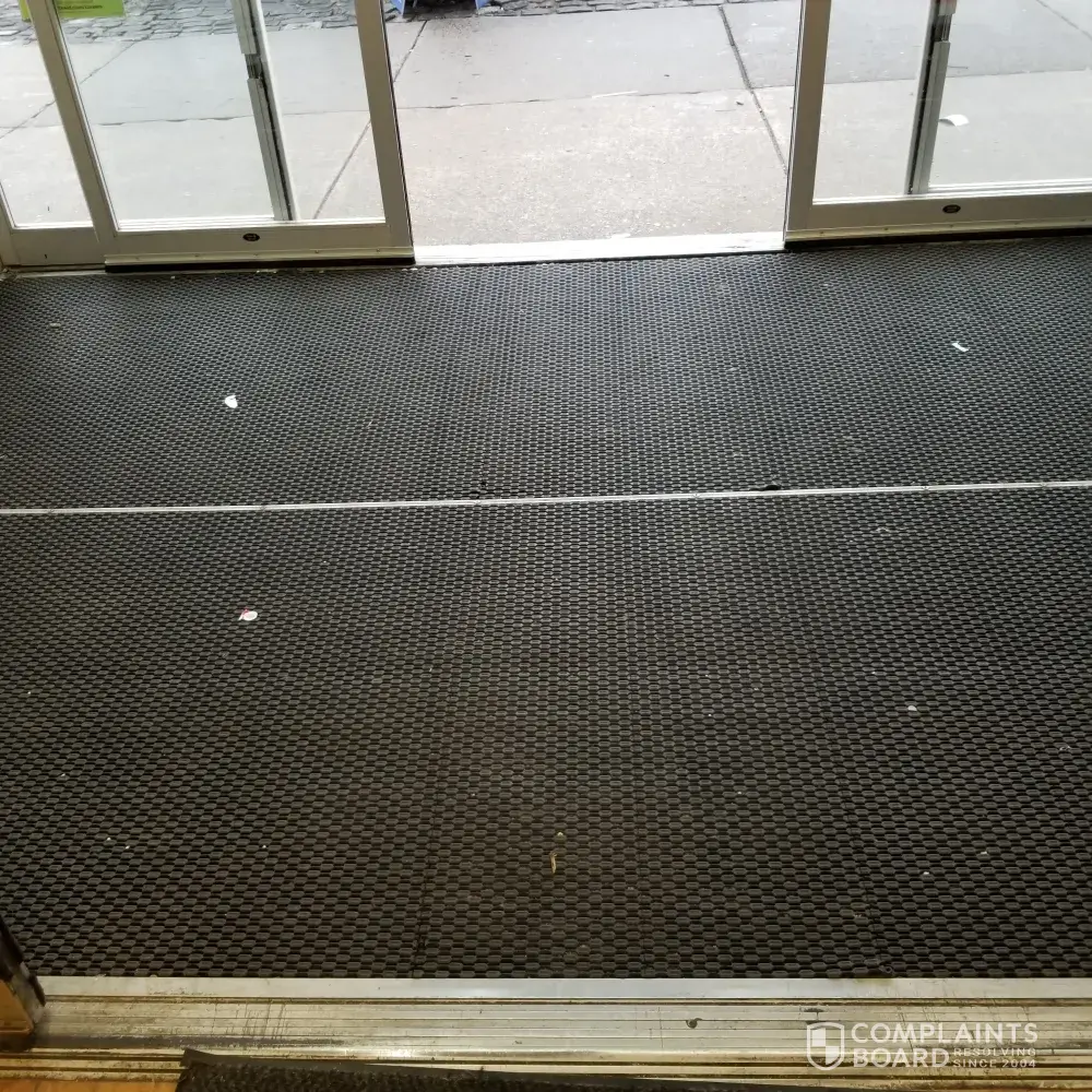 1/3/2020 coming into the doorway at STORE # 00872, I tripped over the loose door mat in the vestibule again coming into the store..I fell hard and bruised my left knee. Passing by pedestrians (2) ladies come into the store to try to help me up, but I didn't feel comfortable with that..because in 7/2019 and 12/2019, I received two total left and right hip...