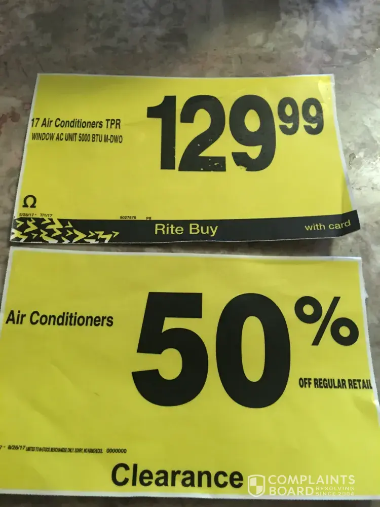 I went to the rite aid near me and they had a 5000 btu daewood ac unit for sale listed as $129.99 with your rite aid card. There was a second sign posted as 50% off . When I went to buy the ac unit I was told it was $100.00 as the retail price was $199.00. However there was a sign posted that the unit was $129.99 with your card and 50% off.