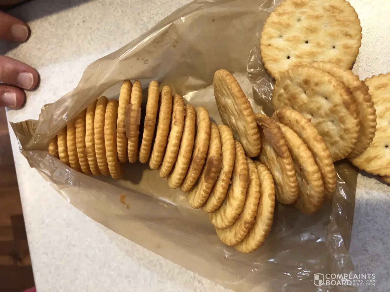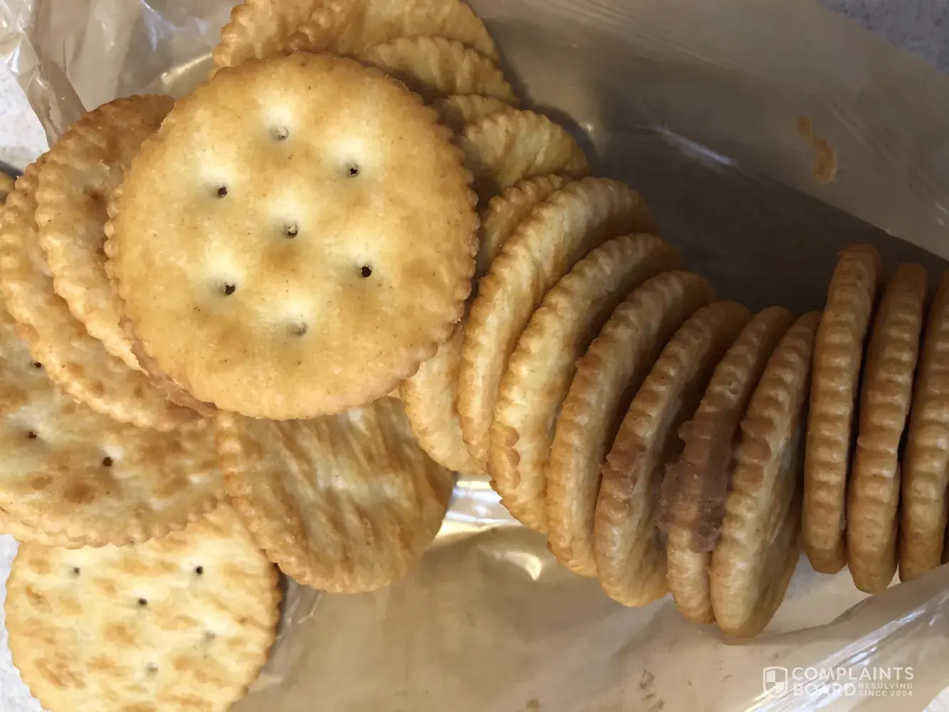 One roll of crackers has peanut butter all inside. So weird. I don't mind peanut butter but I threw it away just in case. I would hate for someone who is allergic to have a bad reaction since these are supposed to just be plain crackers.