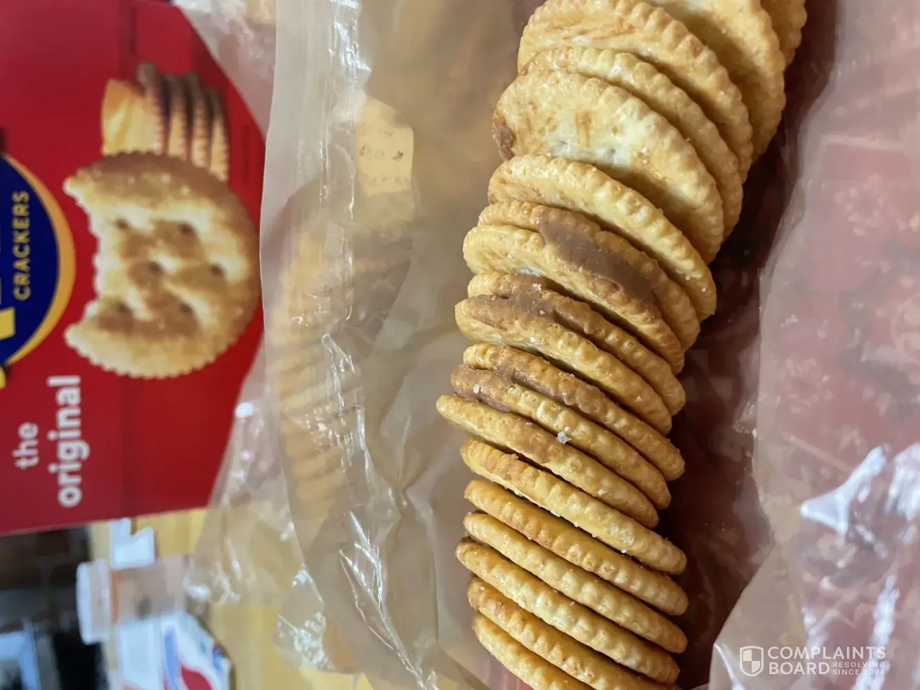 I bought a box of PLAIN ritz crackers. The box with 4 sleeves of crackers. While eating crackers from the last sleeve I noticed something that looks and smells like peanut butter. I have attached pictures. As a grandmother of a child with a peanut allergy and as a pre school teacher this is very concerning to me