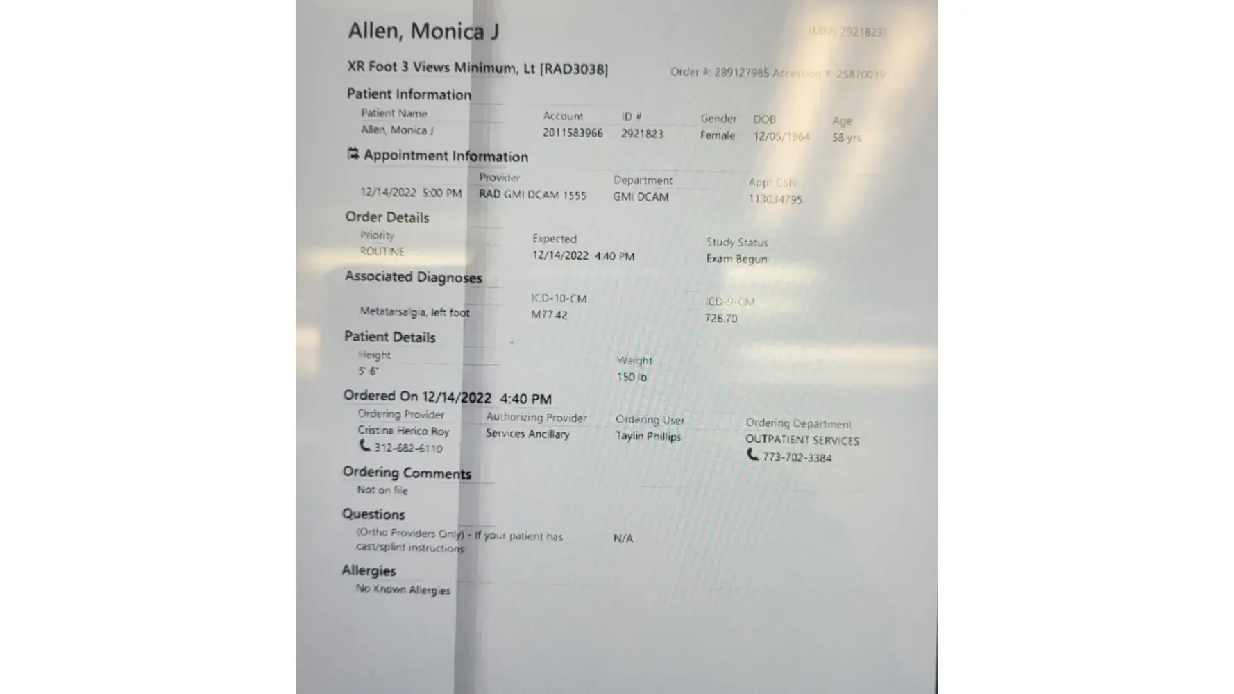 Monica J Allen reported injury