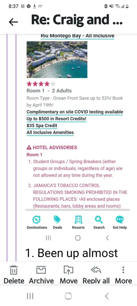 1. Been up almost 24 hours and no food when arrived to RUI Montego Bay. We were told room would not be ready for 3 hours and no food was open.. Waited with no food for 3 hours to get food and room. Went back to office and our room had been ready and the girl that checked us in gave our other room away.
