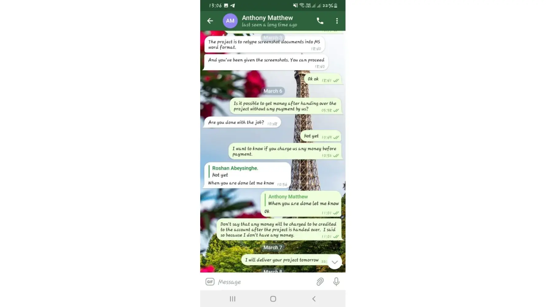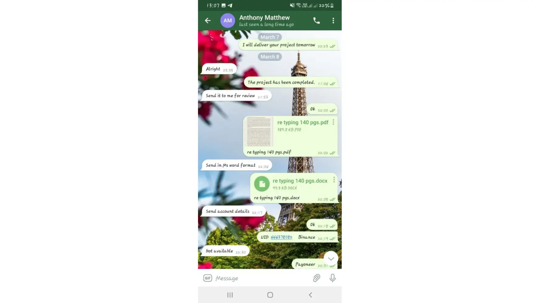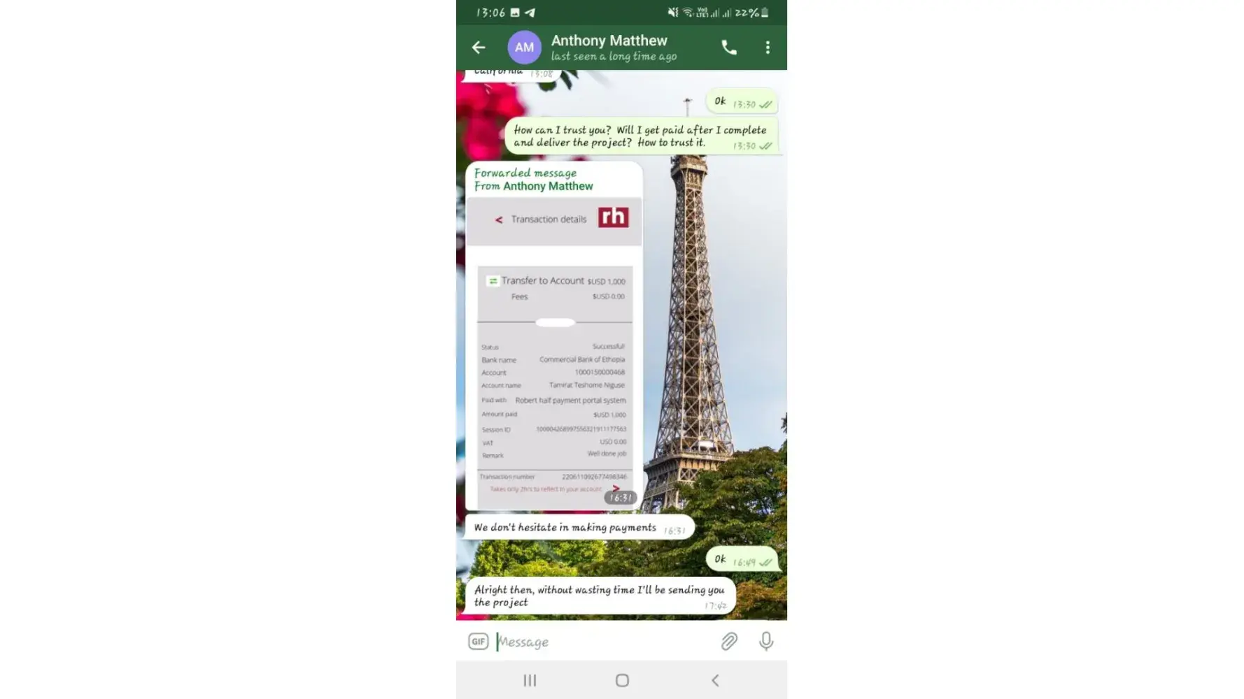 You contacted us through telegram using the company name and got a project for $2200. Once it is successfully completed and delivered, they will block Telegram connections without paying. We took up this project because you gave us the details saying that it is related to the Aayat.