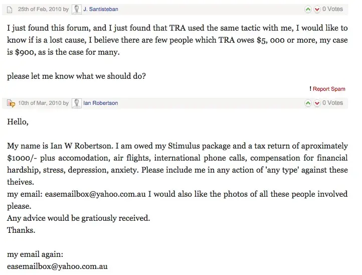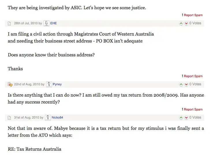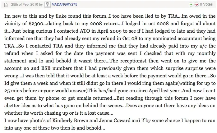 Unfortunately the letter addressed to the Complaints Board concerning the online tax business TRA has appeared in the Google listing under Frangipani Bed & Breakfast. This business address was given with the intention of helping people to effectively recover their losses. But another unrelated business also with the name Frangipani & also located in Port Douglas may have inadvertently been affected. For this reason the people representing P Douglas wish to remove the post by deeming the matter resolved. They wish to express their sincere apologies to the second business & hope that in the six months the post was accessable, this business didn't suffer. They hope the people to whom this letter was addressed, whose furious letters appear on the Complaints Board 'have' benefitted.