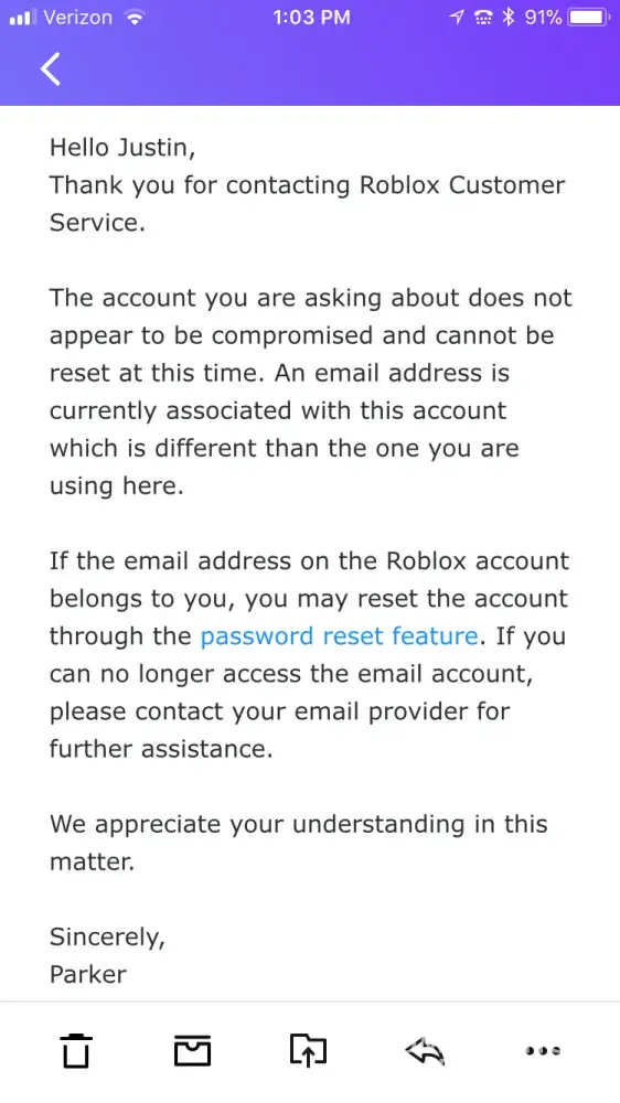 In my situation, ROBLOX did a sudden password reset of all accounts and I had issues with resetting my password due to the associated email being deleted. I emailed them with the offer of verifying my ownership of the account through proof of purchases, and they replied with an automated response. It was quite obviously automated, as they told me to "reset your password with your email" despite the email being deleted. It's pretty much equivalent to stealing since multiple purchases were made on there, yet I don't get to enjoy the benefit of them.