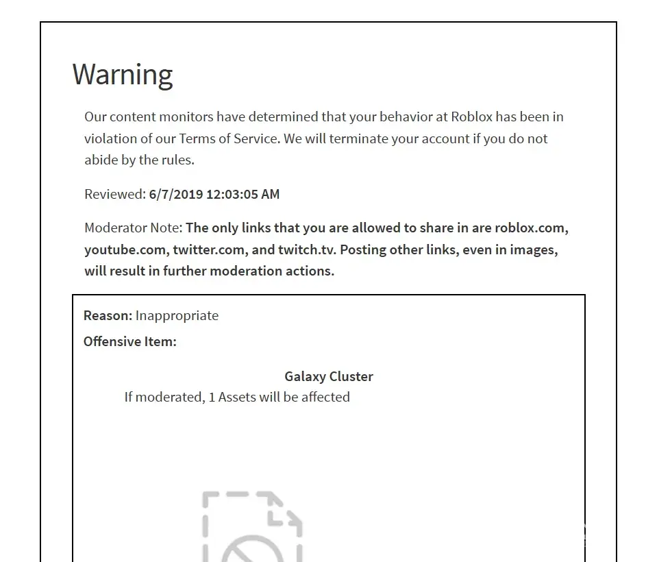 Y'know what? I'm quitting roblox because i don't like that when i try to share something good it turns out to be always innapropriate. I don't get 3 warnings i just get a instant ban. Because every single thing i do that i try to make it not innapropriate i get banned for it for no reason at all and i get banned without warning. I uploaded a galaxy cluster photo but no. INNAPROPRIATE. his banning feature needs to be fixed. Otherwise this game is really dumb. Everything that is not innapropriate is innapropriate. Not fair!