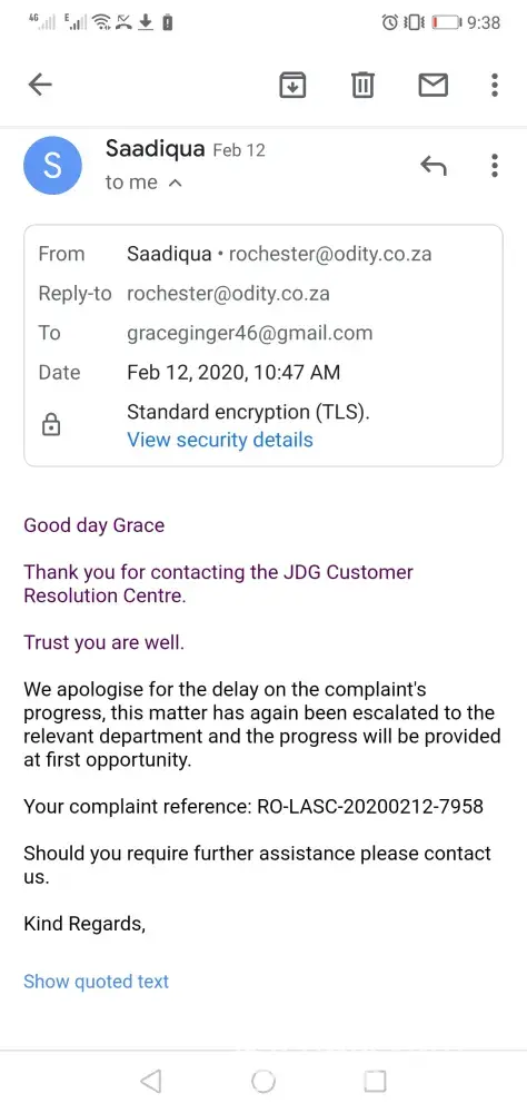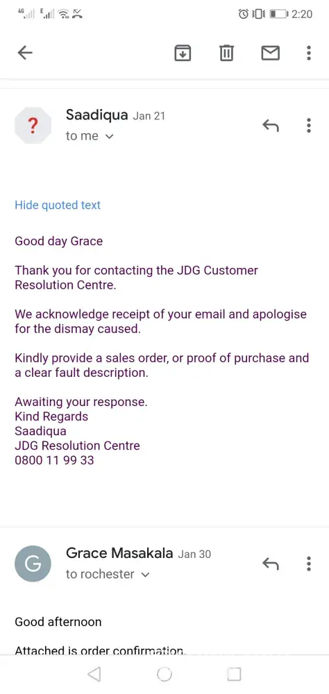 I bought couches on account from Rochester, my 3 seater recliner couch broke during lockdown. I reported it, they came and fetched it in October. It is the 23rd of February and I still do not have my couches. I have phoned numerous times, they sometimes say they will arrange for the pick up of my couches and then are surprised to hear that they have already picked up my couches and I am waiting for delivery. I was promised delivery on the 6th of February, they said the driver will phone me about an hour before delivery. Nobody phoned me on the 6th of February. I have complained online, I have complained on their Facebook page and still nothing, all I get are promises that "someone" will be in touch with me shortly. I have phoned again today (23 Feb 2021) and was promised delivery on the 27th of Feb, again told the driver would phone me an hour before delivery. When I asked for some kind of guarantee that this would indeed happen, I was told they can't give me one. When asking to speak to a manager, said manager responded saying he cannot take my call as he has other things to do and I should just send him an e-mail. His name is Sameer Fakir. Still no couches, still no guarantee that my couches will in fact be delivered as promised.