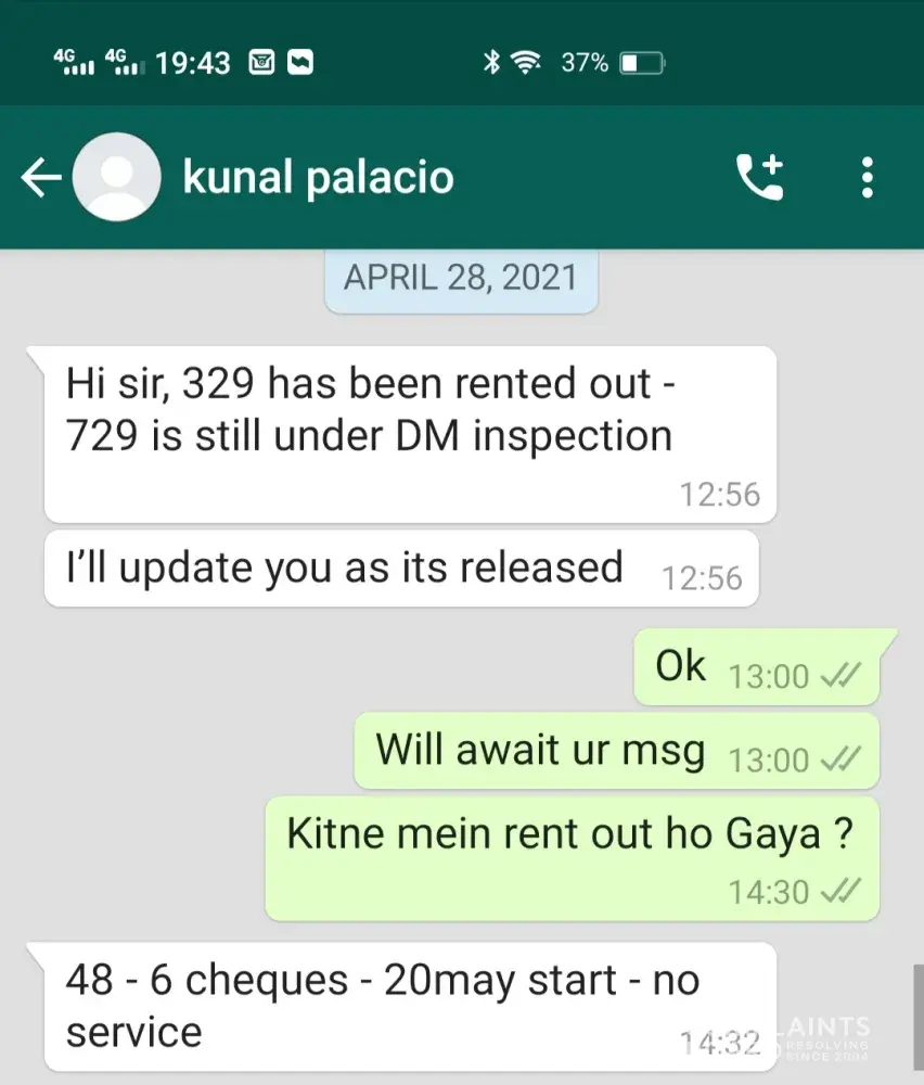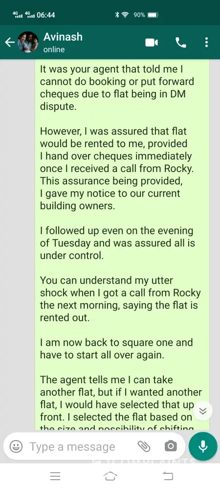 Suddenly on the morning of 4th may I got a call stating the flat was rented out to another. I was in shock as we had made all preparations and upon inquiry I was told that the flat was rented out by the Managing Director himself.