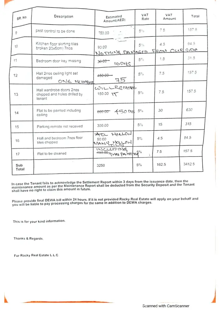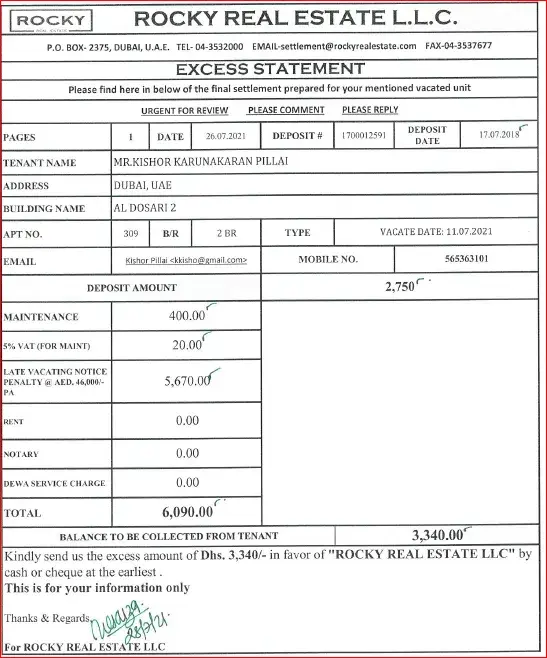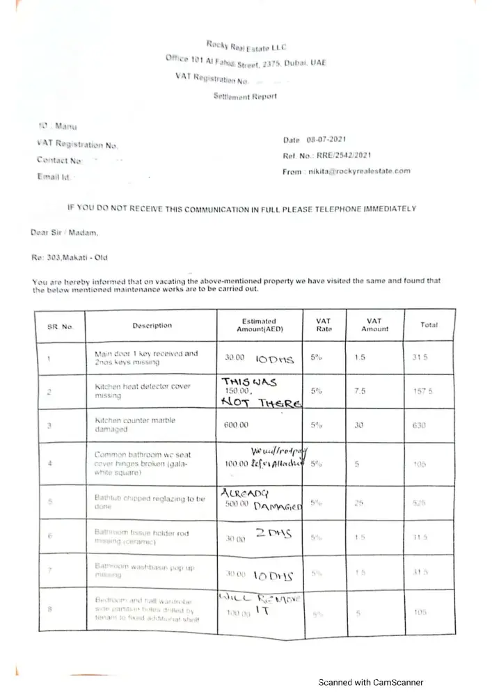 We made a detailed report and mailed it to the maintenance team. We renewed our contract to 2020 with 39K and 500 Dhs maintenance fee due to the pandemic and our jobs being at risk. The kitchen countertop (small piece) got damaged due to the absence of support below it. The toilet seat cover also got damaged. We contacted the maintenance team again and there was still no response from their side. On June 30th 2021 the contract ended and we vacated the apartment after two weeks they sent us a settlement report ( attached below ) as per the report they want us to pay 3412.5 Dhs - deposit amount of 2150 Dhs which is 1262.5 Dhs. They keep calling and sending emails to extract this extra amount out of us. They also threatened us about municipality inspection and additional charge of 1000 Dhs if we don't agree to pay the excess amount. Then we got mail from Dubai land department regarding case registered.