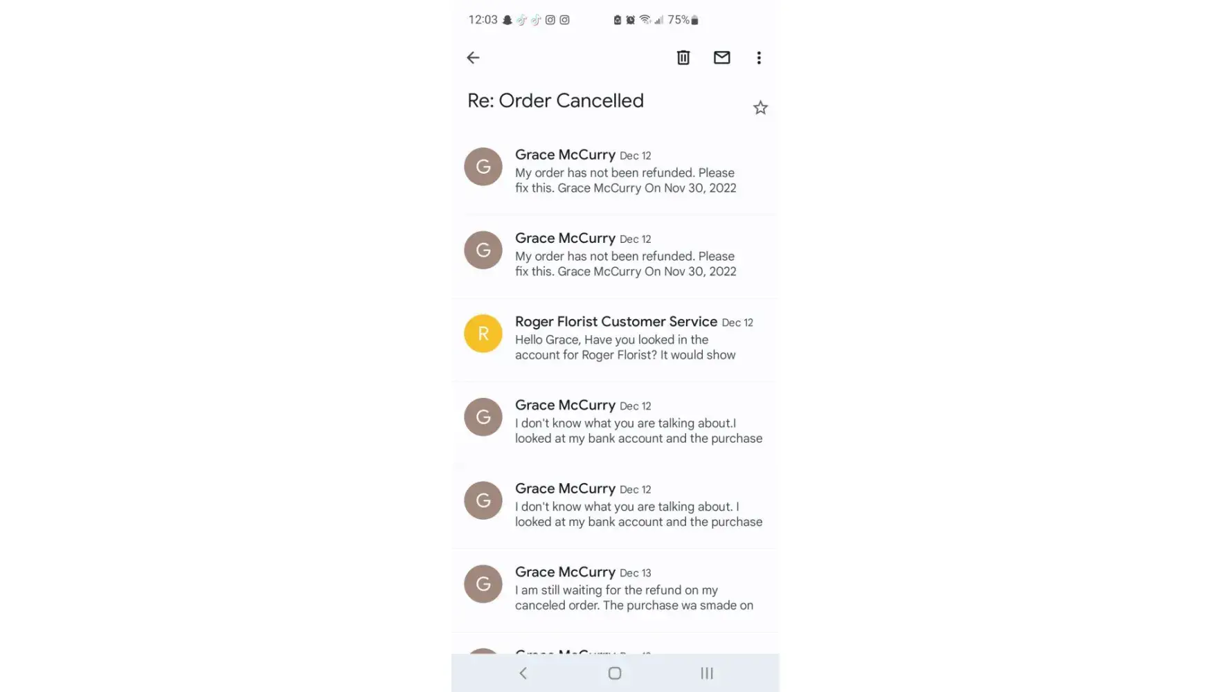 I was furious to say the least. I called them back and tried to explain so they put me on hold with music, then someone else came on and put me on hold with music and after enough of it I hung up. I sent a message to [protected]@Rogerflorist.com and Denise replied and said that she noticed on system that a refund is pending. I disputed with my credit card company but will see if refund is issued soon..2-5 day. According to many previous reviews, looks like I would be very lucky if I do! Shame on them for doing this to us people. I was so excited to send my granddaughter a special arrangement and they blew it! I will report them! People work hard for their money and these people are scamming us.