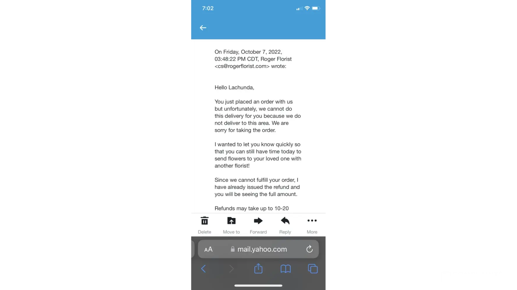 Same thing just happened to me. I ordered flowers on 19 September 22, got same email. Here it is 26 October 22 and I am still out my $70. BEWARE veterans and sr citizens (I am both), you will be ripped off.