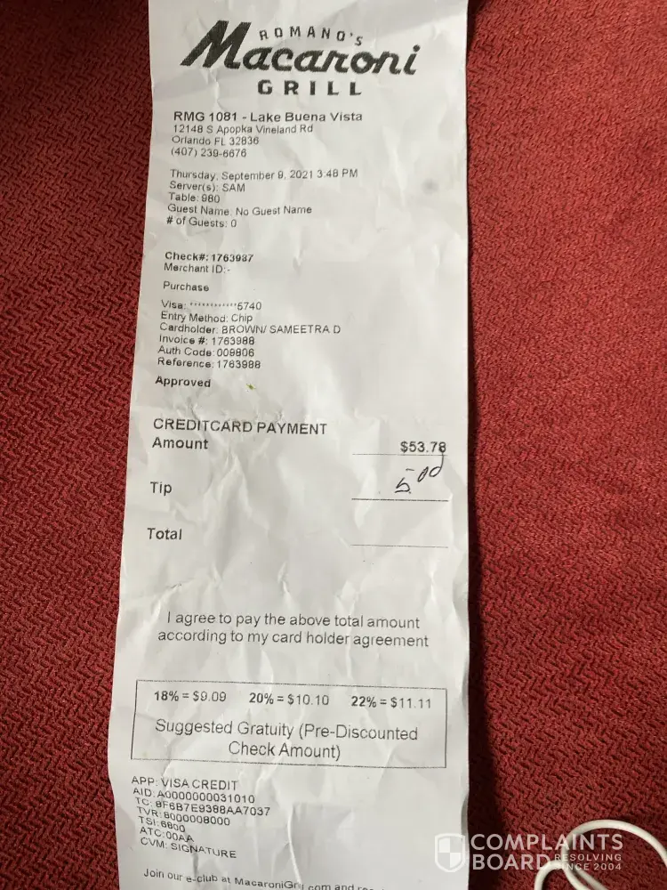 Read full complaintRomano's Macaroni Grill complaints: history and resolution overview