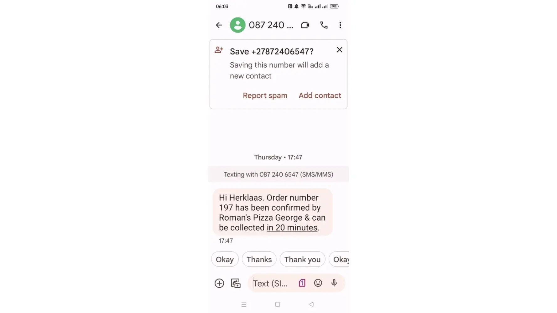 I phoned the LIchtenburg Romans Pizza store with the intention to place an order.