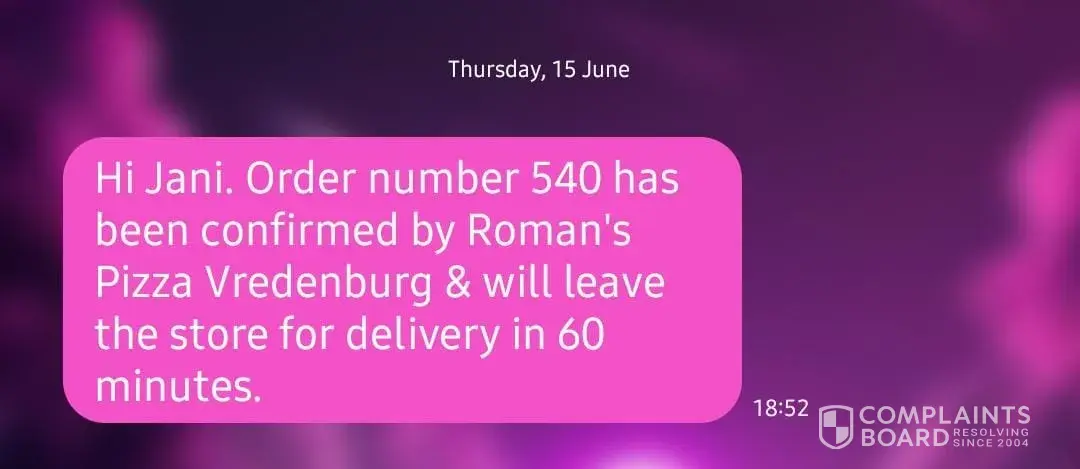 On Thurday 15 June 2023 I ordered 4 pizzas from Romanz Vredenburg at 18h50 at 18h52 I received a sms Romans Vredenburg received your order nr 540 at 19h30 we phoned them after we have not received anything they said they are busy with the deliveries even if it goes after 20h00 they will still deliver at 20h50 I phoned tgem again sorry we don't have a delivery for your adress I phoned back and ask hoe can I get a order nr but you don't have a delivery for me the lady said she will speak to the manager and call me back at 21h00 she phoned me back after I started making other food just to get something ro eat but can they still make us new pizzas I mean really to eat at what time 00h00 so I am very upset and dissapointed in this Branch