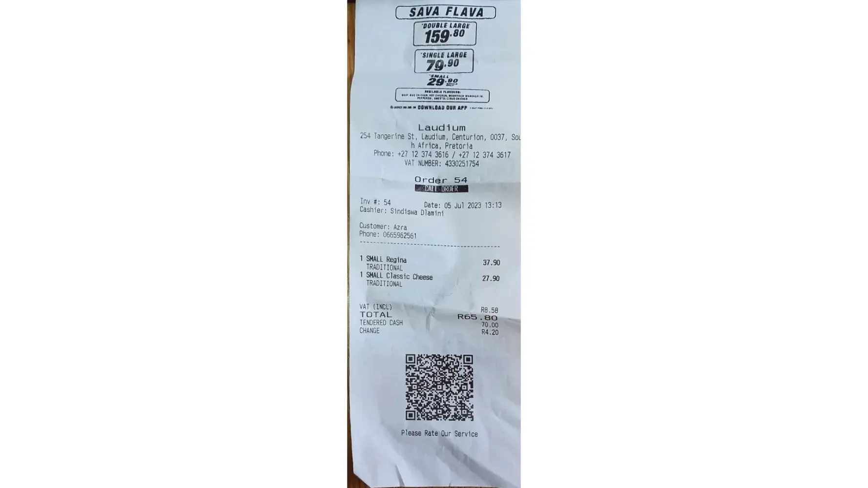 Good day Dear Sir, Madam To whom it may concern. I purchased 2 small pizzas, thin base from Romans at the Laudium branch at 1pm today. I am a frequent consumer at Romans as per my records on telephonic orders. Today, I am deeply disappointed and dissatisfied with the pizza I received. The pizza was burnt and the base thinner than usual. Not edible as the base was hard. I have images of my receipt and an image of the pizza itself. Kindly intervene and assist. Regards Ms S. Rahman
