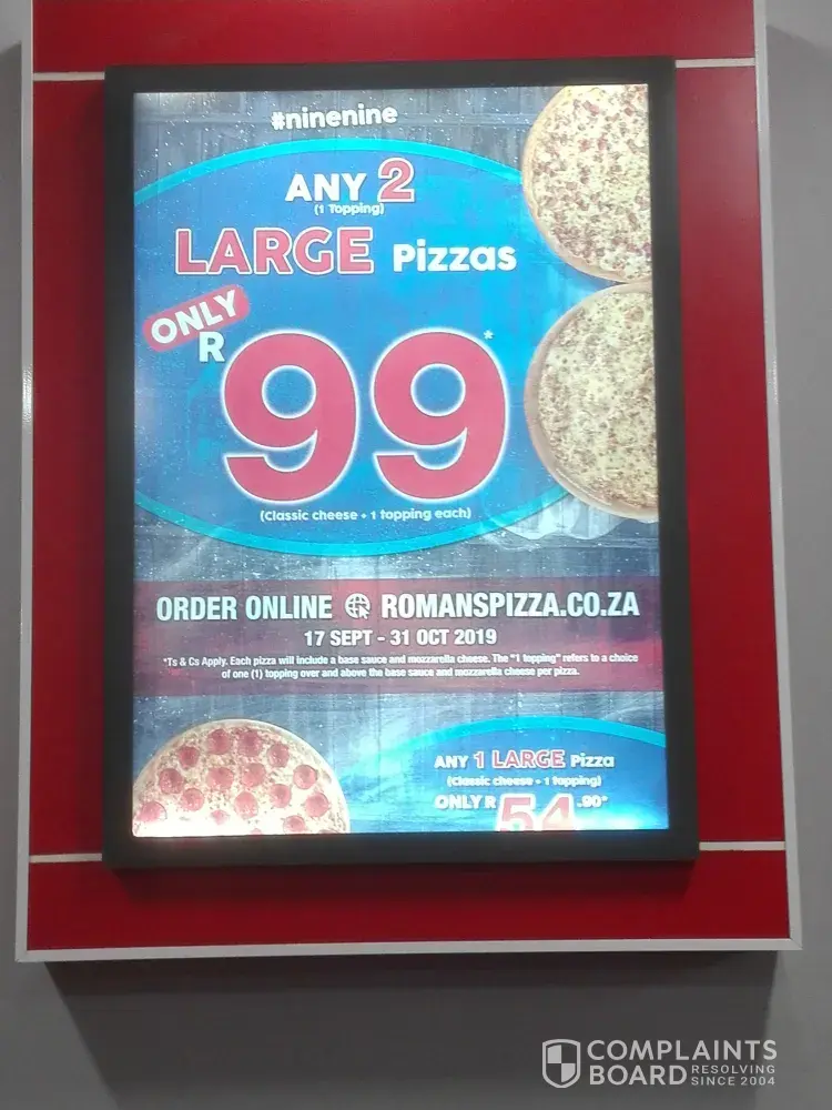 Went to Romanz and the advertisement says that you pay R99 for ANY 2 LARGE PIZZAS. Walked in and we ask, then they showed us a paper that is all scruffy just stuck to to the counter with tape that only has toppings to choose from to put on your pizza. On the 2 large pizza sign in very fine print after walking basically nearly against the sign it says in fine print only one topping. That is unacceptable. The advertisement on the TV says nothing about the one topping only on the pizza. So both is basically wrong advertising. They can definitely shut down Romanz by highland mews and then the worker is rude to us as well to say that we must read the fine print but that's the advertiser's work to make the text bigger so anyone who walks in can see it clearly.