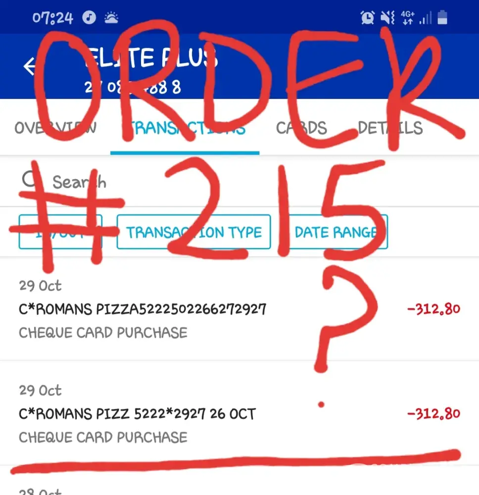 On Saturday 26th October I purchased 4 pizzas from Roman's in plattekloof. The cashier told me the payment decline and processed the payment again today I find 2 payments for the same amount had been taken from Roman's pizza. My order number was 215 and the total was R312.80 however 2 seperate payments of R312.80 were taken from my bank account.