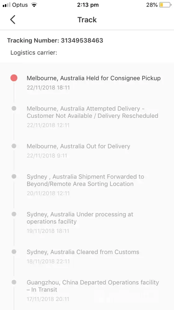I was not home when my package was "delivered" and so it is apparently being "held for consignee pickup". I have not been told where to pick it up from or what company is holding it. I went to my local Australia post and they told me the tracking number is not in their system at all. There are no details anywhere in the app telling me where it is. I did not receive a card or an email telling me anything.