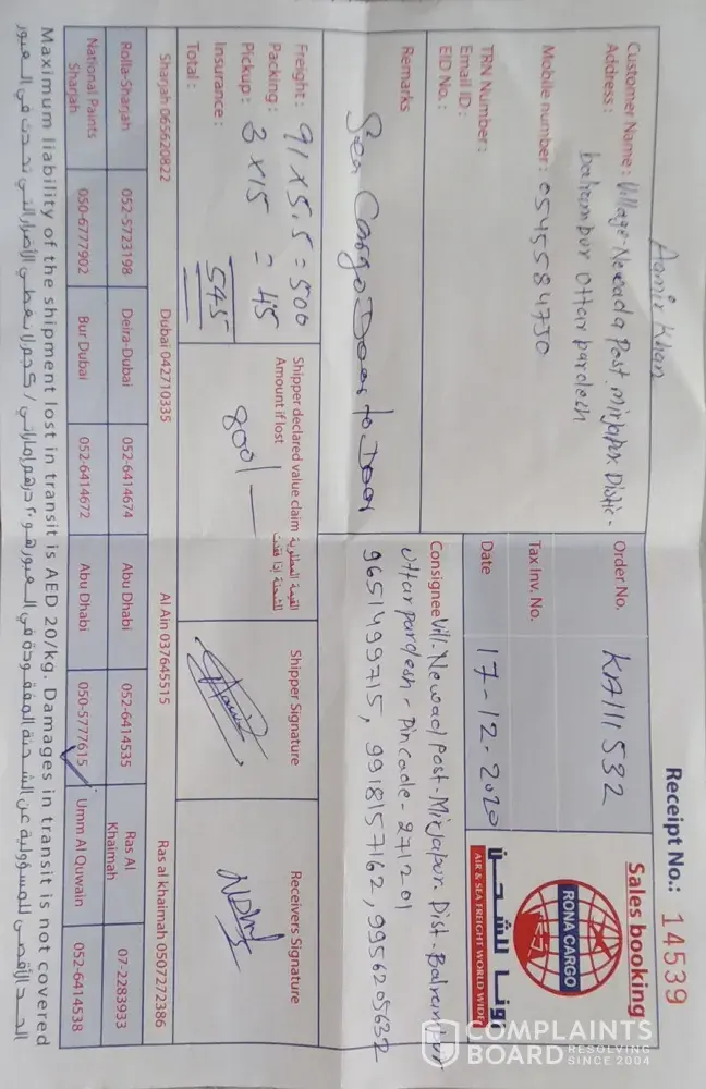 I have bad experience with Rona Cargo, where I sent 2 box to my home in KERALA throgh sea cargo, they said it will delivered with 35 days, until this time 28/12/2020. no one contacted yet, when i contact them in Al Ain office they said it will be delivered within 2 days, after 2 days I call the said one box delivered, where telling lies, now they saying because of clearing issue delay, so these are clear indication this company and staff are Fraud, Now i decide to register a complaint against them, My Advise before send any valuable item to your destination must check that companies customers review... then take decision.