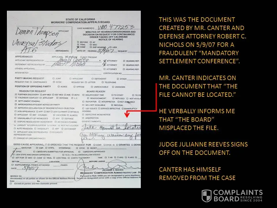 reading this just blew me away I actually thought I was crazy when I thought this man was more on the side of the defence then my sisters case. Yes. lord Yes. unorganize is a understatement, professionalism oh my God how does this man continue to practice law? no these people are not crazy at all not everyone that dont even no each other is lying on this man and his staff. And the idiots he has working for him... man... no words can ever express the unprofessionlism and iliteracy in one law office. how does this man get paid? do anyone ever wonder? how is it he is so buddy buddy with these defence attorneys, I wonder who is really getting paid? my sister fired this man and handled her case herself and she went step by step with the wc they have representatives that will help you. with this kind of representation obviously you dont need to be a high school grad or to settle your own case. Im sorry but if your read this Mr. Canter sir? hey you deserve that much no matter how bad of a lawyer you are and how many cases you lose, you went to college for maybe 12 to lose cases. My question is how do you sleep at night doing people that come to you and trust you with at the lowest time in their life and you screw them over like that. why did you become a lawyer to hurt people? dont you know one day you are going to screw over. the wrong client and the right lawyer will take you and your buddys to the cleaners oneday...complaints is what opens investigations, it is sad to put your name in a search engine and find nothing but complaints... I dont mean to offend you because you are a older man but, hey if I was you I would just stop... one day you will lose and your career will be over and for what? NOTHING! I am going to pray for you because something is seriously wrong. I wondering how many complaints was turned into the bar? my sister started to send in a complaint but she said forget it, she got what she wanted herself out of her case. See Mr. Canter what you dont realize God takes care of his fools and his kids, so these people you dislike because they are poor or not up to your standards, dont represent them then change your study, obviously you dont like the kind of people that you took a oath to represent. Again Mr. Canter no disrespect ment here.