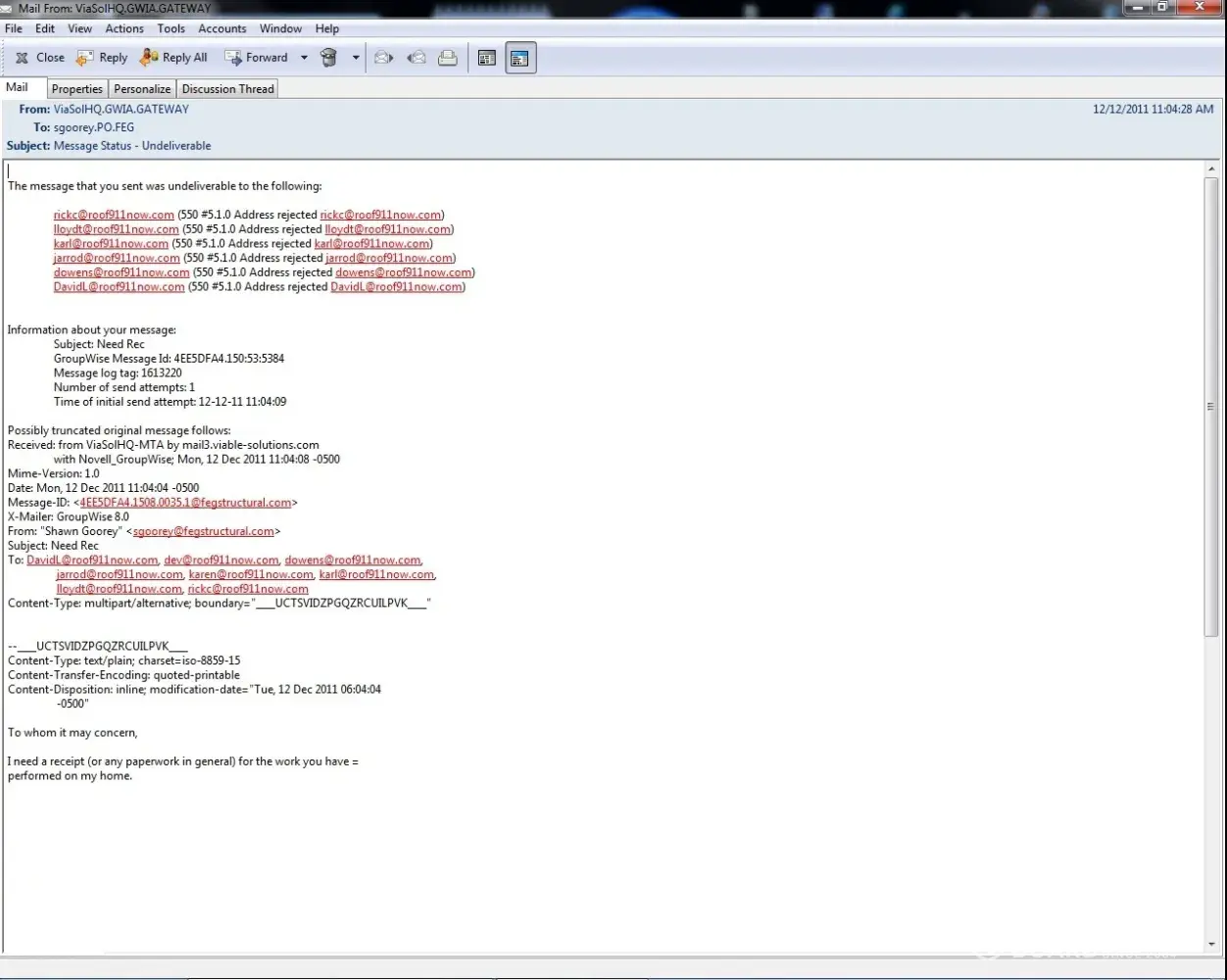 September 1st, Jake told me (via text message) that Roof911 was waiting for another home in my area, so they could do the work on both homes in the same day. That never happened. The last I heard from Roof911 (via Jake's text message) was on October 18th, 2011. Jake told me to contact someone named Tracy at the main Charlotte office for further information on my home repairs, since he was no longer employed by Roof911. All Roof911 Charlotte area phone numbers have been disconnected, all Charlotte employee emails (and most Atlanta emails) bounce back. I've called Roof911's CEO Dev Adenek several times, left several messages and emails, with no return call/email.