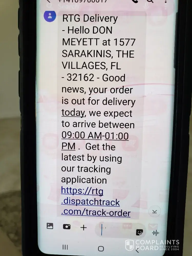I request the delivery be rescheduled, but they advise me that the furniture is on the truck and that I have 2 choices - accept the midnight delivery or cancel - no rescheduling permitted! So I have no choice but to cancel. During this call I get another one from the "dispatcher" at RTG who advises me that she has nothing to do with deliveries - she's the truck dispatcher! So the RTG delivery dispatcher tells me she has nothing to do with deliveries - some real talent they have working there. The dispatcher (who has nothing to do with deliveries) confirms the approximately 11 PM delivery.