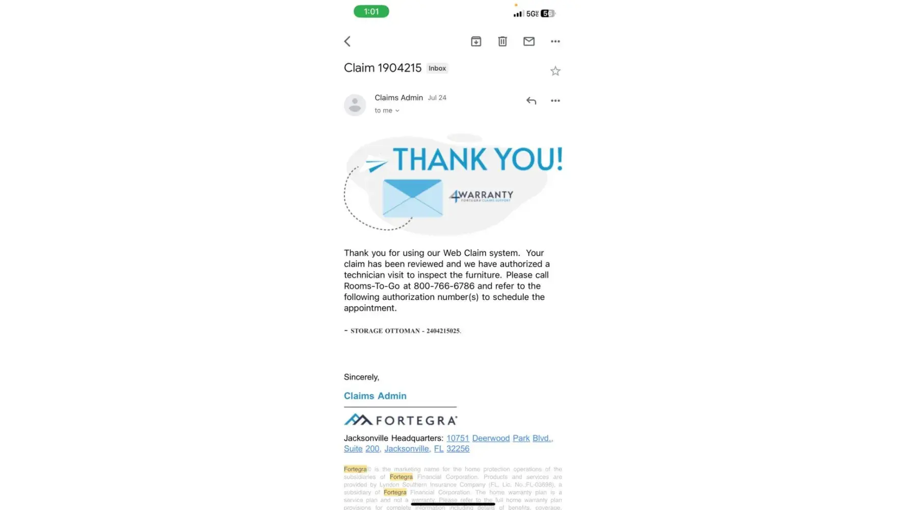 My Ottoman was damaged and I filed a claim to get it fixed. Fortegra and Rooms to go told me I was still in warranty. The claim went through, I talked to Fortegra and Rooms to go and they said they would send a technician. I had a technician come out August 1st. The technician checked the damage and he said I need to order a part, we will fix this in 3-4 days and don't worry its covered so you have to pay nothing. I waited 2 weeks after not hearing back and I called and they said the claim is still open, they probably have a delay in getting the parts someone will reach out to you soon. I waitied 10 more days and called back today and rooms to go told me, I have a note that you have to call the Warranty company and they will give you the final resolution. I was transferred to Fortegra and they said oh so your claim has been denied because your warranty expired July 14, 2023 and you put the order in July 24, 2023. I asked to speak to a supervisor, I told them that why would my items appear on their web app if it was not in warranty? Why would it let me put a claim in if my items were not in warranty? Why would they approve a technician visit if there was no warranty? So they made me waste my time waiting on technicians on calls and noonee could tell me I was not in warranty? Fortegra and Rooms to go both told me I was in warranty. i have the emails where they approve my service request and now they won't honor the fix?