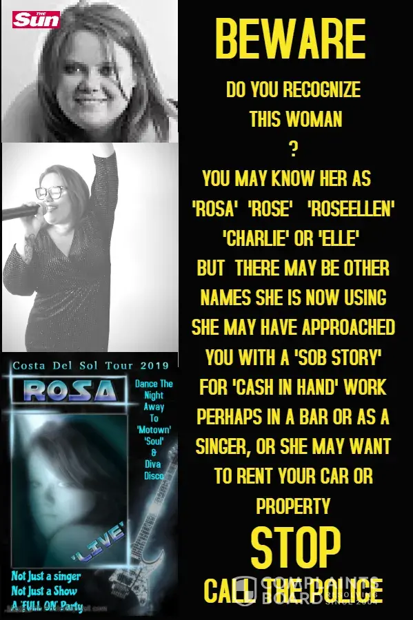 ok, after discussion with the uk authorities and spanish authorities here is the real ‘ROSA', In the UK, even though she has had many business including a bar with a turnover approaching a million pounds, she has never paid a single penny in tax or vat! the best guess at what she owes in the uk in tax and vat alone is in region of 250, 000 pounds and rising, and that is only based on that bar alone, there is a large amount of unpaid credit and debit cards, in various names and aliases, used to fund her lifestyle, overdrafts and bank loans, in various names and again, unpaid. most of this is serious crime, but the most shocking revelation to me was 2 years after my father had come to spain, and without my knowledge she still carried on unlawfully claiming my fathers pension and had it paid into an her english bank account {although she assured me that she had informed the benifits agency he was no longer eligable to claim it and even showed me an email to that end }, so it appears that English athourities were closing in on her last week. Now her Spanish situation