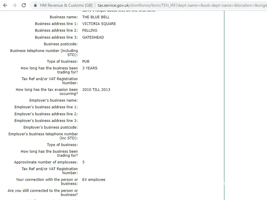 One matter which Rose Ellen Bennett cannot escape of course is UK tax evasion, today I have worked with the HMRC and provided all of the evidence they need to secure a prosecution for the wholesale tax fraud she carried out whilst running two pubs in the UK, it now transpires she never paid ONE PENNY in tax, vat, national insurance for herself or any employees, see the forms below which have been submitted to HMRC,